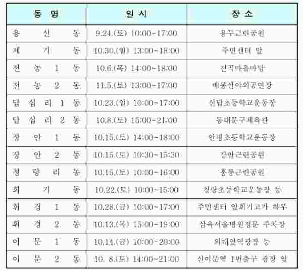 오는 24일 오전 10시부터 오후 5시까지 용두근린공원에서 진행되는 ‘제5회 용신동민의 날 기념 2022 어울림 한마당 축제’로 막을 열게 된 ‘우리 마을 문화제’는 11월 5일 전농2동의 행사를 끝으로 마무리된다.