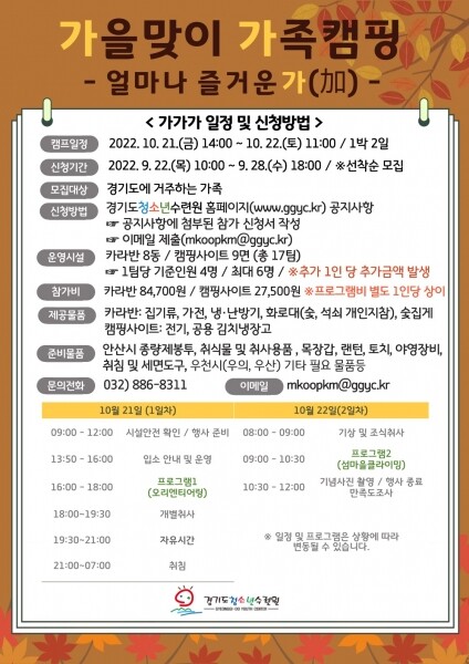 참가비는 1가족 4인 기준 카라반 84,700원, 캠핑사이트 27,500원이며 기준 인원 초과 시 1인당 카라반 5,500원, 캠핑사이트 2,200원 추가 비용이 발생한다.
