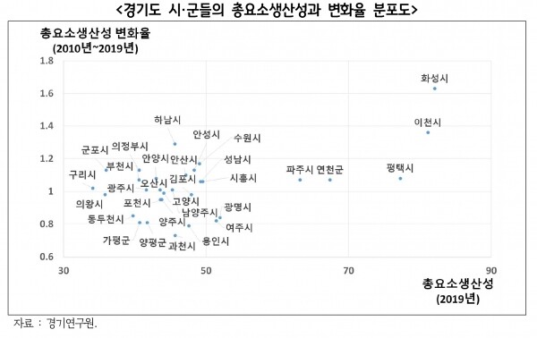 지역 성장의 기술적 효용성을 나타내는 총요소생산성 분석 결과, 2010년 대비 2019년의 총요소생산성 개선은 화성, 이천, 하남, 수원, 군포의 순으로 2019년 시점에서는 상위 5개 도시에 화성, 이천, 평택, 연천, 파주의 순으로 나타났다.