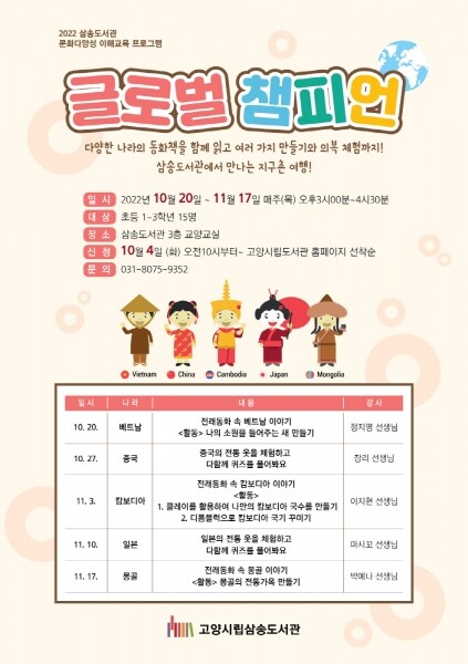 각 나라의 전래동화를 함께 배우고 전통의상 체험, 퀴즈, 만들기 수업 등 다양한 체험 활동을 통해 다른 나라의 문화를 이해하고 배우는 시간이 될 예정이다.