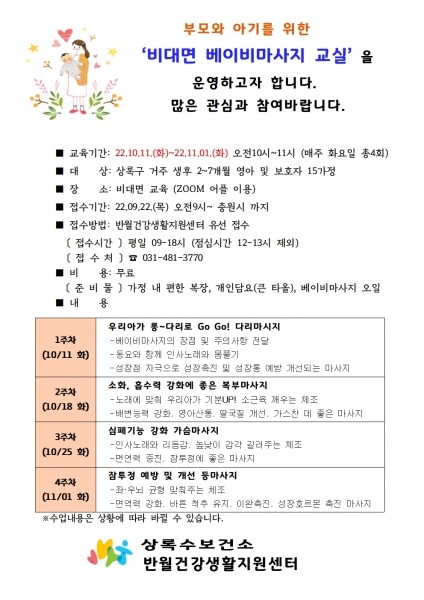 대상은 상록구에 거주하는 생후 2~7개월 영아 및 보호자 15가정으로 신청은 선착순으로 반월건강가정지원센터에 전화로 접수하면 된다.