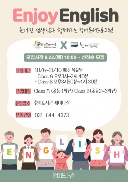 Enjoy English 프로그램 모집은 9월 22일 목요일 오전 10시부터 시작되며 자세한 프로그램 내용 및 일정은 이천시통합도서관홈페이지를 통해 확인할 수 있다.