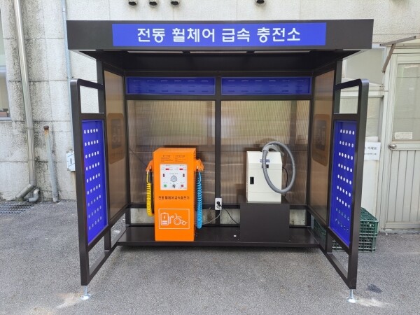 급속 충전기는 전동휠체어 2대를 동시에 충전할 수 있으며 바퀴에 바람을 넣을 수 있도록 공기주입기도 내장돼 있다.