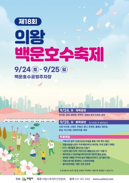 의왕시축제추진위원회 주관으로 열리는 이번 백운호수축제는 가족이 함께 즐기는 시민 참여형 축제로 다양한 공연과 경연을 비롯해 체험행사, 시민 참여마당, 놀이·전시캠프, 열린무대 등 다채로운 프로그램이 풍성하게 꾸며진다.
