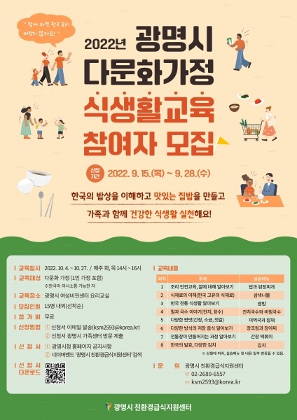 참여를 원하는 대상자는 9월 28일까지 광명시 누리집 공지사항 또는 네이버밴드 ‘광명시 친환경급식지원센터’를 참고해 신청하면 된다.