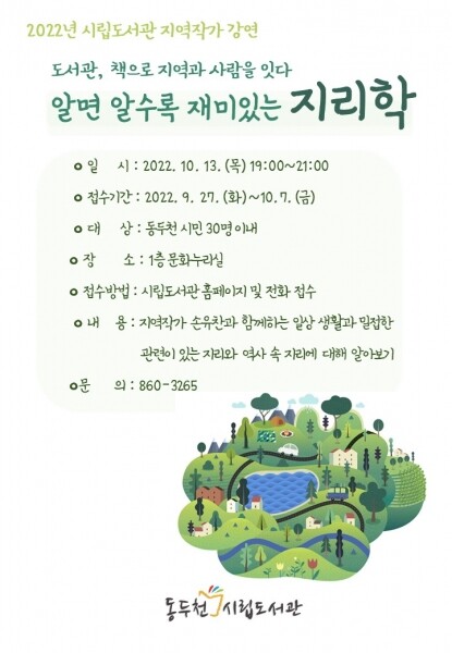 한편 동두천시립도서관은 지난 4월 동두천 작가들의 창작력과 인지도를 높이고 시민들에게 관내에 알려지지 않은 작가들을 소개해 지역과 지역작가에 대한 자부심을 고취하고자 ‘우리 동네 지역작가실’을 마련하고 다양한 주제의 지역작가 강연을 진행하고 있다.