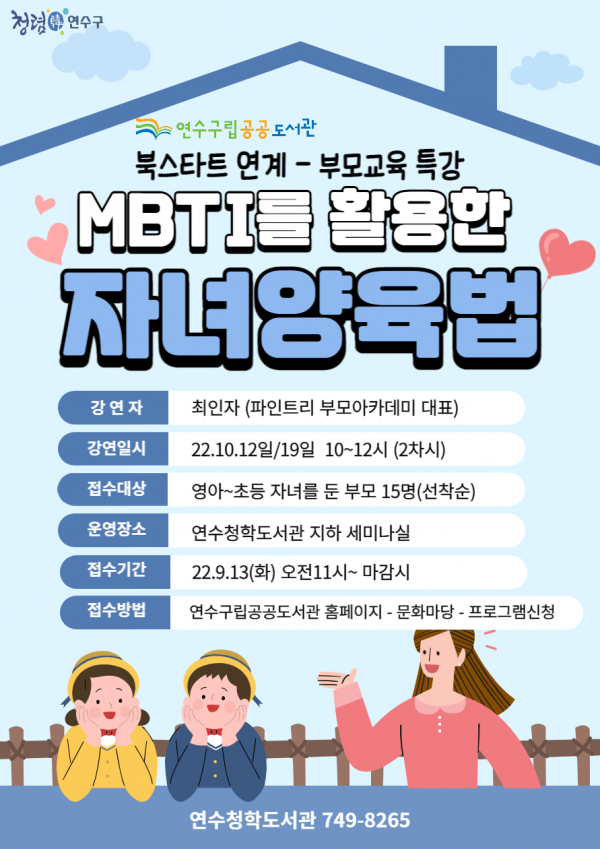 이번 강연은 2022 북스타트 부모교육 네 번째 강연으로 최인자 강사와 MBTI의 16가지 유형에 대한 이해, 유형별 소통방식의 차이, 아이유형별 부모 양육의 팁, 질의 응답을 통한 실제 사례들을 통해 일상육아에 바로 적용 가능한 방법들을 터득해 나가는 시간을 갖는다.