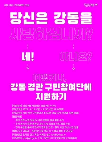 강동구를 사랑하는 주민이라면 누구나 신청할 수 있고 참여단으로 선정되면 직접 구정에 참여하며 현실성 있는 경관 개선 방안을 함께 찾고 내실 있는 사업을 발굴하는 역할을 하게 된다.