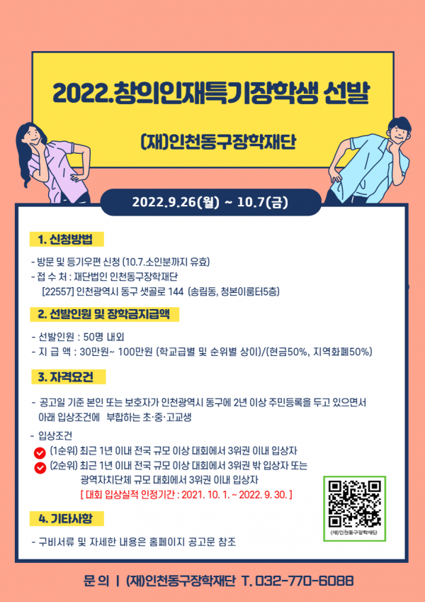 ‘창의인재 특기장학생’의 선발대상은 9월 19일을 기준으로 본인 또는 보호자가 2년 이상 동구에 거주하고 있는 초중고교생 중 최근 1년 이내에 개최된 각종 예술체육수학과학 분야 대회에서 입상 실적이 있는 학생이며 구비서류를 갖춰 장학재단 사무국을 방문하거나 우편으로 신청하면 된다.