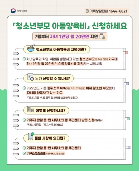 지원 대상은 ‘청소년복지지원법’에 근거, 부모 모두 만 24세 이하인 가정이며 기준 중위소득 60% 이하에 해당되면 지원이 가능하다.