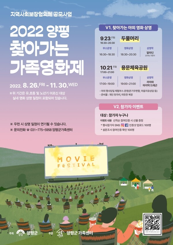 박우영 센터장은 “양평군은 농촌 지역으로 문화·여가에 대한 높은 욕구가 있지만, 현실적인 여건이 어려웠다”며 “양평읍을 제외한 다른 지역으로 찾아가는 가족영화제를 통해 사각지대에 있는 군민들의 욕구를 해소하고 특정 대상에 한정된 서비스가 아닌 아동, 청소년, 성인, 그리고 노인에 이르는 생애주기 전체를 포괄해 지역공동체 전반의 회복을 도모하며 지역주민이 모여 너와 나 그리고 우리라는 공동체적 엔데믹 블루를 예방하고 회복할 수 있는 통합적 방법으로 다가서고자 한다”고 전했다.