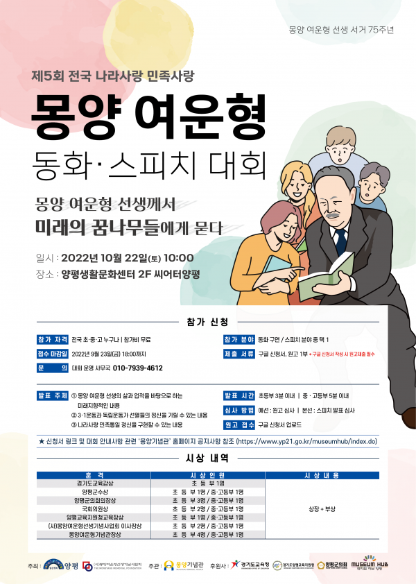 몽양기념관이 주관하고 양평군과 몽양여운형선생기념사업회가 주최하는 이번 대회는 전국 초·중·고등학교 학생들을 대상을 자신감 넘치게 자신의 의지를 전달하고 실천했던 독립운동가이자 민족지도자인 몽양 여운형 선생의 삶과 정신을 알리고자 매년 개최하는 몽양기념관의 대표적인 문화행사다.