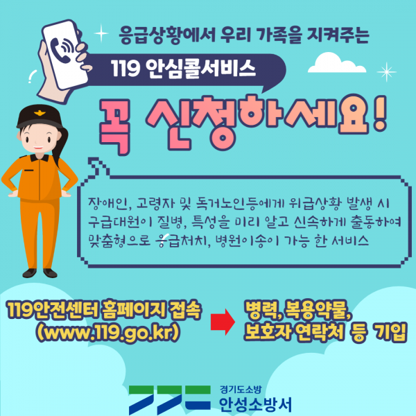 ‘119안심콜서비스’는 대국민 구급서비스로 장애가 있는분, 고령자 및 독거노인 등에게 위급상황 발생 시, 119구급대가 요구조자의 인적사항, 지병 및 질병 특성, 복용중인 약 등 상황 특성을 미리 알고 신속하게 출동해 맞춤형으로 응급처치와 병원이송이 가능한 서비스이다.