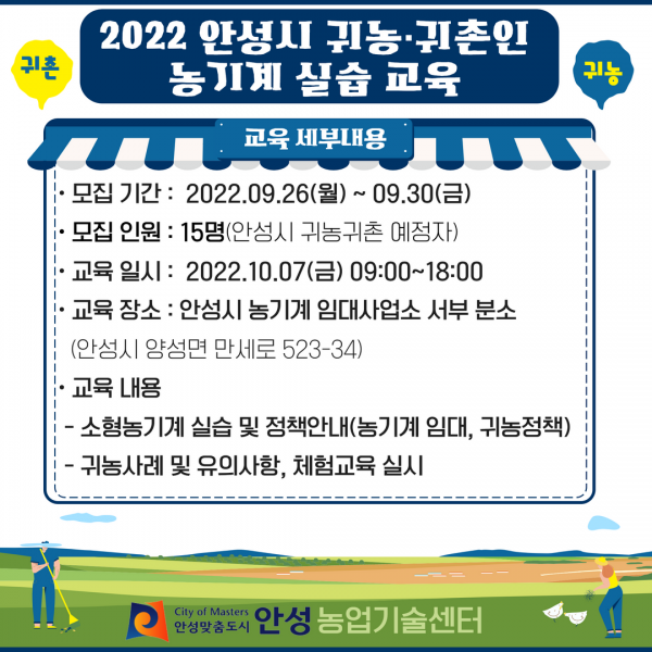 10월 7일 오전 9시부터 오후 6시까지 진행될 이번 교육은 농기계임대사업안내, 귀농정책안내, 귀농귀촌사례 교육 및 소형농기계 실습교육 등으로 구성돼 귀농귀촌인에게 필요한 종합 교육 형식으로 진행될 예정이다.