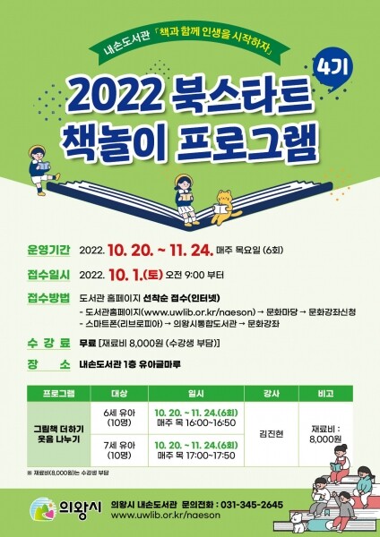 프로그램은 총 6회 과정으로 10월 20일부터 11월 24일까지 매주 목요일마다 대면으로 진행되며 10월 1일부터 내손도서관 홈페이지를 통해 6세와 7세, 각 10명을 선착순으로 모집하고 수강료는 무료이다.