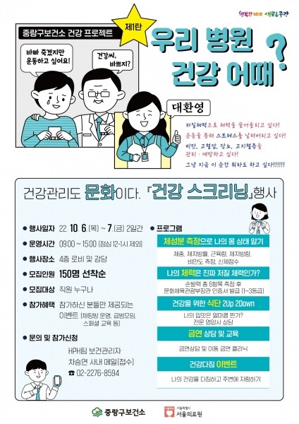 또한 오는 10월 6일부터 이틀간은 중랑구 보건소가 서울의료원에 직접 방문해 ‘건강 스크리닝’ 행사를 진행한다.