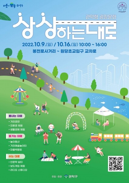 관악형 광장문화 ‘상상하는대로’는 ‘구민의 상상이 곧 현실이 되는 대로’의 의미를 담고 있으며 광장, 중앙공원 등 도심 속 소통 공간에 대한 구민의 욕구를 반영해 구민과 지역 내 문화예술인들이 함께 어울릴 수 있는 공간이다.