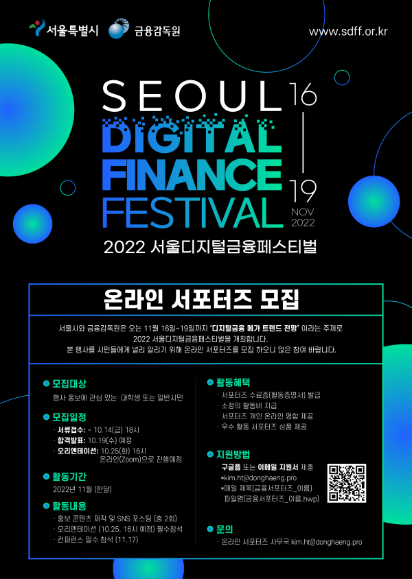 ‘서울디지털금융축제’ 온라인 홍보단은 디지털금융 분야에 관심이 많고 사회관계망를 통해 적극적으로 행사 홍보를 할 수 있는 대학생 또는 일반시민 누구나 지원할 수 있다.