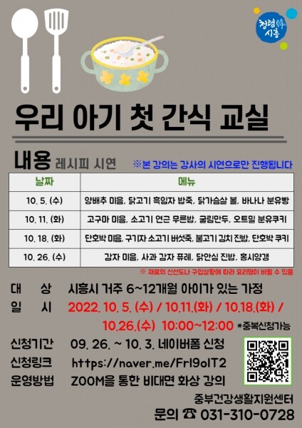 단계별 이유식 메뉴 선정과 조리법 등 올바른 정보를 제공해 아이들이 균형 있는 식사를 섭취할 수 있도록 초기 이유식부터 완료기 간식까지 1회 수업 당 4가지의 다양한 레시피를 강사가 시연한다.
