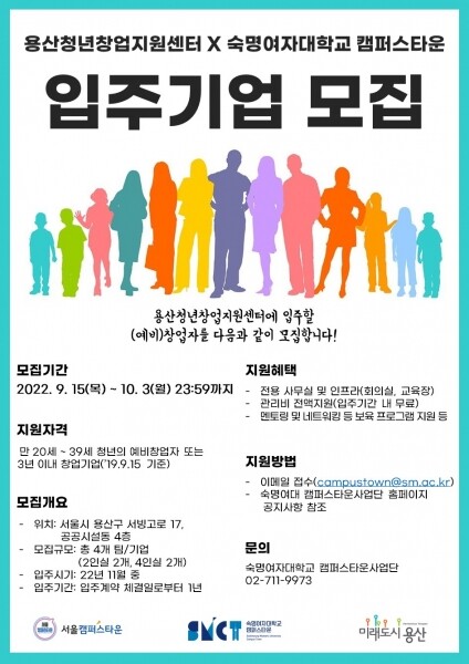 한편 구는 2020년 10월 용산 센트럴파크 해링턴스퀘어 구민편의 복합시설 내에 청년창업지원센터를 개관하고 숙명여대 캠퍼스타운사업단과 공동 운영 중에 있다.
