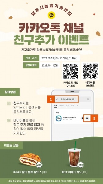 참여방법은 ‘양주시농업기술센터’ 카카오채널을 친구추가 후 캡처해 네이버폼을 통해 이벤트에 응모하면 된다.