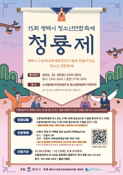 청룡제는 평택시고등학교학생회장단연합 ‘평학련’이 2008년부터 현재까지 기획·운영하는 평택시 청소년 대표 축제로 코로나 세계적 유행으로 작년에는 비대면으로 운영되었으나 올해는 ‘전통’을 주제로 대면으로 진행할 예정이며 관내 고등학교 학생자치회 또는 17세~19세 청소년으로 구성된 청소년 동아리부스 20팀과 공연 11팀을 10월 13일 오후 6시까지 모집하고 있다.