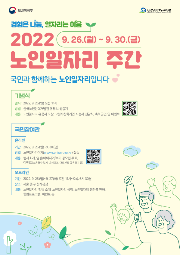 보건복지부가 주최하고 한국노인인력개발원이 주관하는 이번 행사는 오프라인과 온라인 방식으로 진행되며 “노인일자리 누리집“을 통해 참여할 수 있다.
