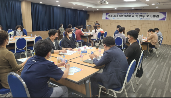 교육 순서에 따라 중앙재해대책본부에서 마련한 ‘코로나19 상황별 모의훈련 시나리오’를 기반으로 구성원별 역할을 분담하고 감염병 유행 대응 상황에 따른 모의 훈련이 실시됐다.