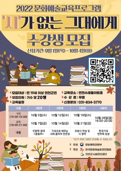 교육은 매주 수요일 오전 10시부터 12시까지, 금요일 오후 7시부터 9시까지 나눠 기수당 20명씩 모집해 10월 28일까지 진행된다.