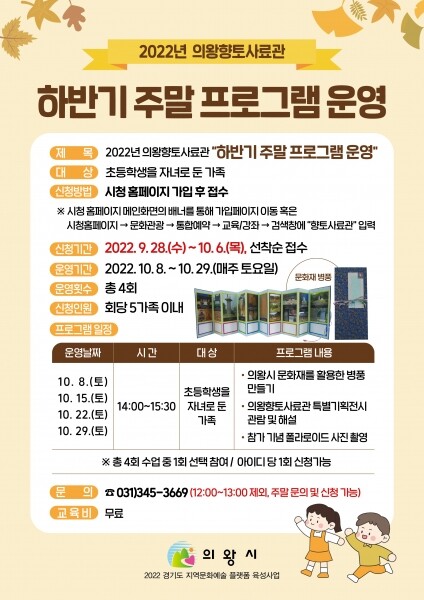 운영시간은 매주 토요일 오후 2시부터 3시 30분까지며 9월 28일부터 의왕시청 홈페이지의 통합예약시스템을 통해 신청이 가능하고 교육비는 무료이다.