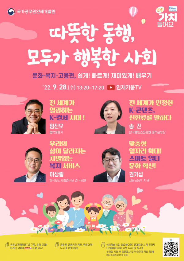 국가공무원인재개발원은 28일 ‘문화·복지·고용 정책편, 쉽게 빠르게 재미있게 배우기’를 주제로 ‘온세상 지식탐구생활, 안녕 가치 들어요' 공개강좌를 개최한다고 27일 밝혔다.