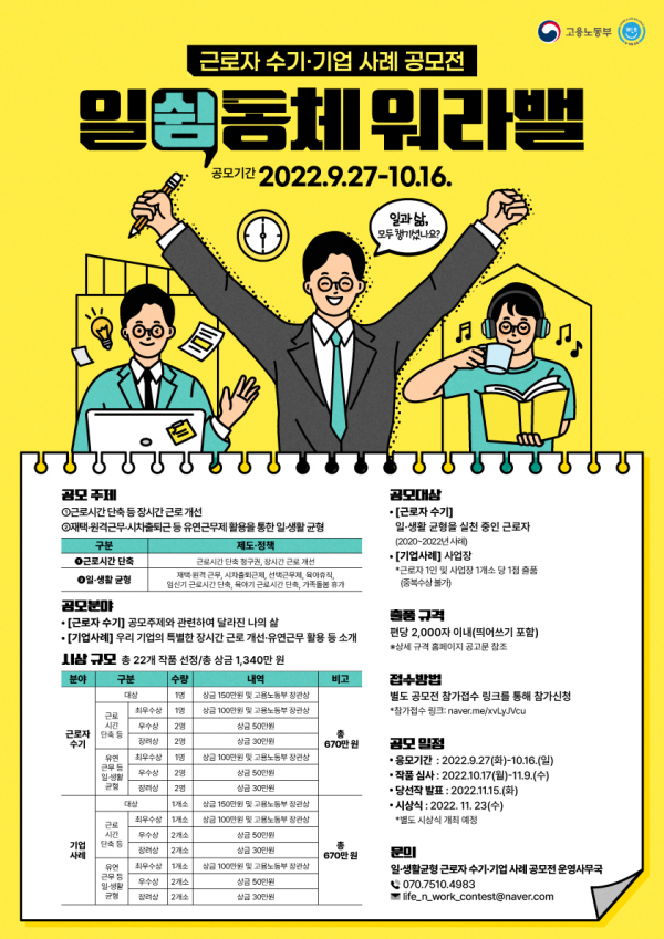 응모 분야는 근로시간 단축 등 장시간 근로 개선과 재택·원격근무·시차출퇴근 등 유연근무를 통한 일·생활 균형 등을 주제로 해, 근로자를 대상으로 하는 “근로자 수기” 분야와 기업을 대상으로 하는 “기업 사례” 분야로 나뉘어 진행한다.