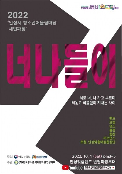 ? 안성시와 여성가족부가 주최하고 한국청소년복지문화원 안성지부가 주관하는 ‘너나들이’는 ‘2022 안성맞춤 남사당 바우덕이 축제’가 열리는 안성맞춤랜드에서 청소년들이 주체적으로 기획한 축제의 한마당으로 펼쳐진다.
