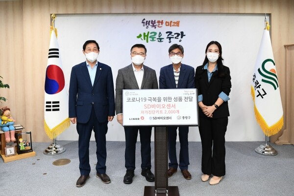 지난 26일에는 류경기 중랑구청장과 조성연 중랑구의회 의장, ㈜SD바이오센서 관계자 등이 참석한 가운데 성품 전달식을 진행했다.