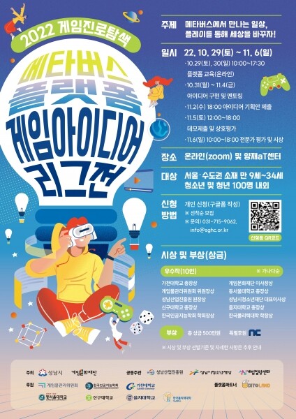 세부 일정은 10월 29~30일메타버스 플랫폼 전문가의 게임 제작과 사용법 온라인 교육 10월 31일~11월 4일개별 게임아이디어 구현과 제작 멘토링 11월 2일게임 아이디어 기획안 제출 11월 5일시험 제작품 제출과 상호평가 11월 6일전문가 평가와 시상 순이다.