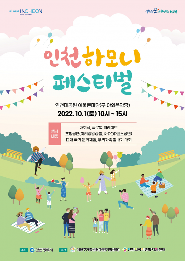 인천시가 주최하고 인천 다문화가족지원거점센터인 계양구 가족센터와 인천외국인종합지원센터가 주관하는 이날 행사는 인천에 거주하는 외국인주민과 다문화가족 등 1,000여명이 참여해 다양한 나라의 문화를 체험할 수 있는 축제로 진행된다.