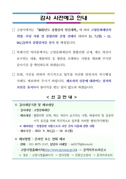 한편 고양특례시는 제보사항에 대해 감사기간 중 사실 여부를 확인해 잘못된 사항에 대해서는 시정 등의 조치를 하며 감사결과를 고양시청 홈페이지에 공개할 예정이다.