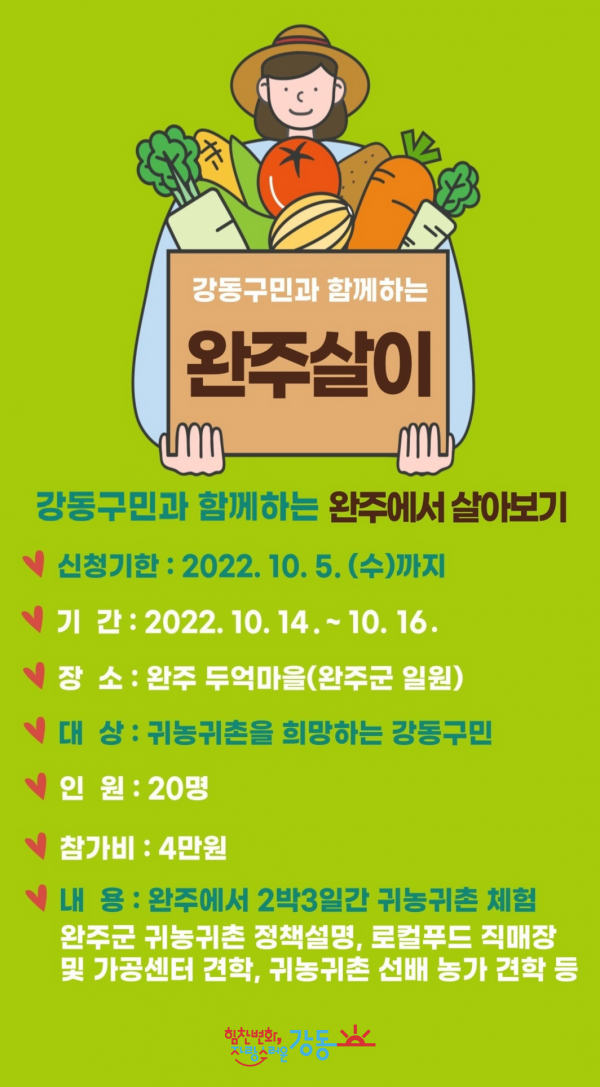 강동구와 완주군이 협업해 진행하는 이번 교류는 평소 귀농귀촌에 관심이 있으나 쉽게 도전해보지 못한 도시민에게 잠시나마 농촌에서 살아보며 귀농 선배의 실질적인 조언을 들을 수 있는 좋은 기회가 될 것으로 보인다.