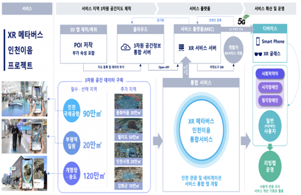 이 사업은 인천 주요지역 7곳에 대한 확장현실 메타버스 서비스와 3rd Party 중심의 지역 생태계 구축으로 클라우드 기반의 지속가능한 확장현실 메타버스 통합 서비스를 상품화한다는 것이 주 내용이다.