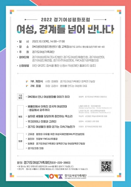 ‘여성, 경계를 넘어 만나다’를 주제로 열리는 이번 행사는 전쟁과 분쟁, 분단에 따른 여성 폭력과 인권 문제에 대응하는 국내외 민간활동 사례를 공유하고 경기도 정책과제를 공론화하기 위해 마련됐다.