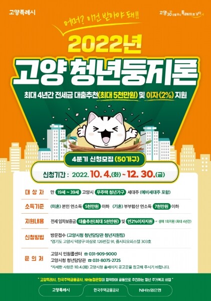 고양 청년둥지론은 한국주택금융공사와 NH농협은행과 협약해 무주택 청년가구를 대상으로 최대 4년간 전세임차보증금 대출추천 및 연 대출이자 2%를 지원하는 사업이다.
