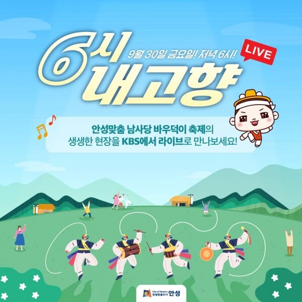 9월 30일부터 시작하는 ‘안성맞춤 남사당 바우덕이 축제’의 개막에 맞춰 개막 첫날 ‘6시 내고향’ 특집 생방송이 안성맞춤랜드 축제장 특설무대에서 진행된다.