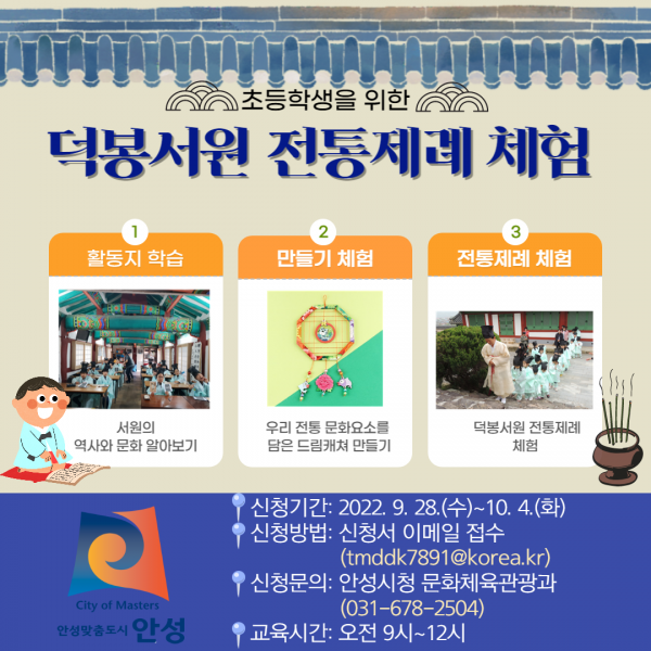 이번 ‘덕봉서원 전통제례 초등체험 프로그램’은 초등학교 3~6학년을 대상으로 덕봉서원에 대해 알아보고 양곡 오두인 선생을 기리는 전통제례를 체험해볼 수 있게 구성됐다.