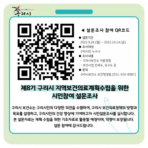 이번 조사는 구리시 제8기 지역보건의료계획 수립을 위한 기초자료로 활용하기 위해 실시하는 것이다.