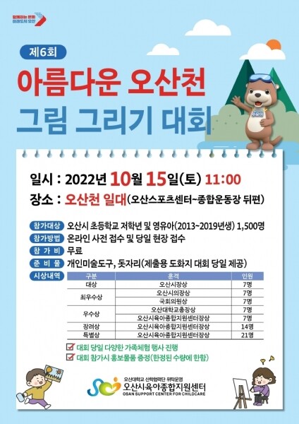 올해로 6회를 맞이하는 이번 대회는 시민 친화형 친수 하천인 오산천에서 ‘맑고 아름다운 오산천 그림 그리기’를 주제로 진행된다.
