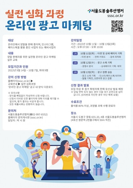 [뉴스써치] 도봉구에 위치한 서울도봉솔루션앵커에서 ‘실전심화과정 온라인 광고마케팅’, ‘디자이너를 위한 양말제작실습’, ‘온라인 유통 마케팅-온라인 상품페이지 실무’ 교육의 수강생을 모집한다.