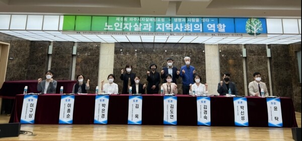 이어진 패널 토론에는 김경숙 파주경찰서 생활안전과장, 김도연 서영대학교 사회복지행정과 교수, 김옥 파주시노인복지관 맞춤복지과장, 박신성 파주시의회 의원, 박은경 파주시자살예방센터 팀장 등이 참여해, 지역사회 기관의 협력을 바탕으로 사회적 관심이 필요한 사안임을 인식하고 사회 안전망 구축 방안 등을 논의했다.