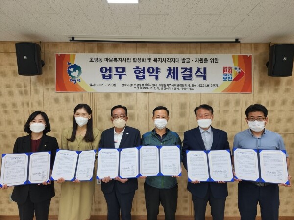 협약기관은 초평동행정복지센터를 포함해 초평동지역사회보장협의체, 누읍동 휴먼시아 1단지, 이림아파트, 오산 세교2LH 12단지, 오산 세교2LH 21단지까지 총 6개 기관이다.