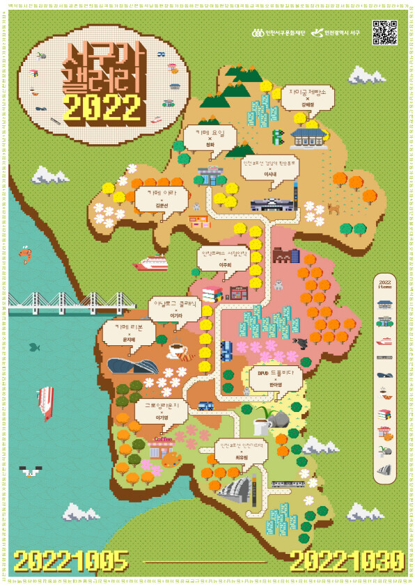 검단에서는 자미궁 제빵소-강혜정, 카페 요일-청화, 검암·경서에서는 카페 아라-김문선, 인천 2호선 검암역 환승통로-이시내, 청라에서는 아날로그 클래식-이기라, 카페 리본-문지혜, 가정·석남에서는 안착프레스 서점 안착-이주희, 그로잉 라운지-이기영, 가좌에서는 DPVD드폴비다-한아영, 인천 2호선 인천가좌역-최유림 등 공간과 작가가 매칭되어 참신한 조화를 이루는 색다른 전시가 진행된다.