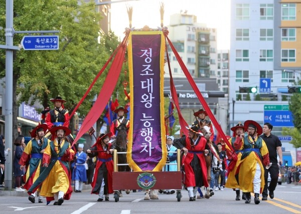 정조대왕 능행차 공동 재현행사는 아버지 사도세자의 능을 참배하기 위해 어머니와 함께 수원화성으로 떠났던 정조의 여정을 재현하는 행사다.